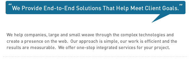 We offer one-stop shopping for your web design needs. What sets us apart is that we offer an integrated solution for your project. Which means you do not have to hire different experts for different needs. Some designers do not do online marketing or outsource your hosting to a third party or aren't experts in search engine optimization (SEO). From a development standpoint it is advantageous to have the same company perform the different tasks beacuse they will have indepth knowledge of the project and code.